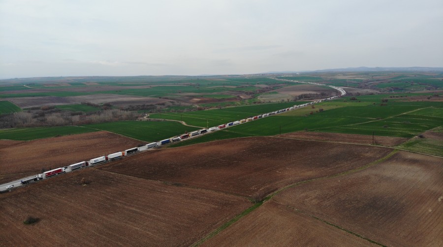 Edirne'de Hamzabeyli Sınır Kapısı'nda ihracat yüklerini götürmek için bekleyen tır sürücüleri kilometrelerce kuyruk oluşturdu.