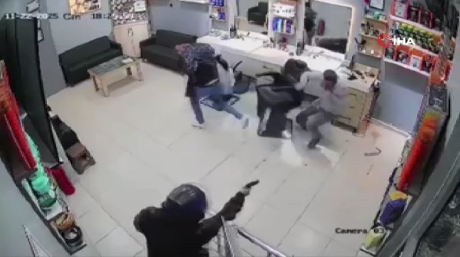 Sinop'un Ayancık ilçesinde motosikletli 2 kişi, berber dükkanına silahlı saldırı düzenledi. Berberin bacaklarından yaralandığı olay kameraya yansıdı.