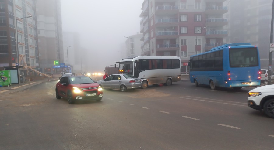 Sisin etkili olduğu sabah saatlerinde öğrencileri okula götürmek isteyen okul servisi ile binek araç, yerlerin ıslak olmasından dolayı kaza yaptı.