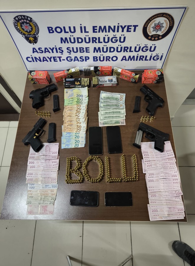 Bolu'da bir sitenin otoparkında tabancayla tehdit ettikleri kişinin 1080 euro, 950 dolar ve 16 bin 400 TL'sini gasbeden 4 kişi, 2 şehirde düzenlenen operasyonla yakalanıp, tutuklandı.