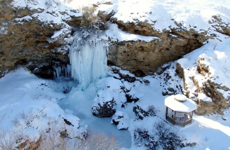 Bayburt'ta, Divanyolu Dağları ile Kırklar Tepe eteklerinden doğduktan sonra Kopuz Deresi'nden yaklaşık 20 metreden dökülen Sırakayalar Şelalesi buz tuttu.