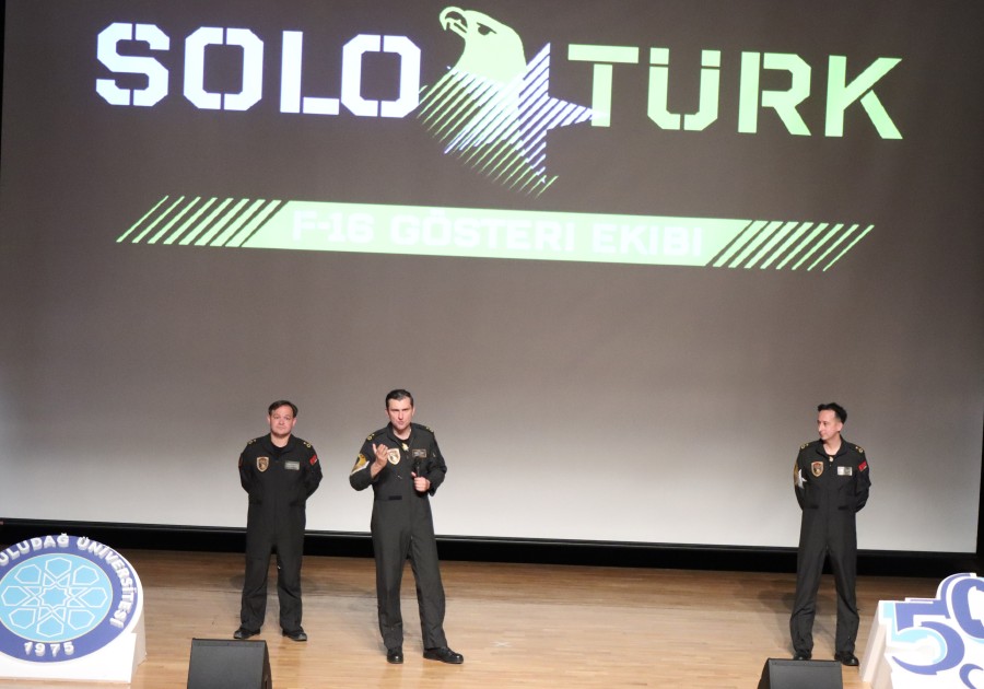 SOLOTÜRK'ten Hava Pilot binbaşılar Murat Bakıcı ve Mustafa Erhan Aydemir ile Hava Bakım Binbaşı Tuna Karalı, Hava Bakım Astsubay Kıdemli Başçavuş Cemil Cefa, Hava Bakım Astsubay Üstçavuş Deniz Görmez Bursa Uludağ Üniversitesi Prof. Dr. Mete Cengiz Kültür Merkezi'nde söyleşide öğrencilere SOLOTÜRK'ü tanıtıp, havacılık hakkında merak edilenleri cevaplandırdı.