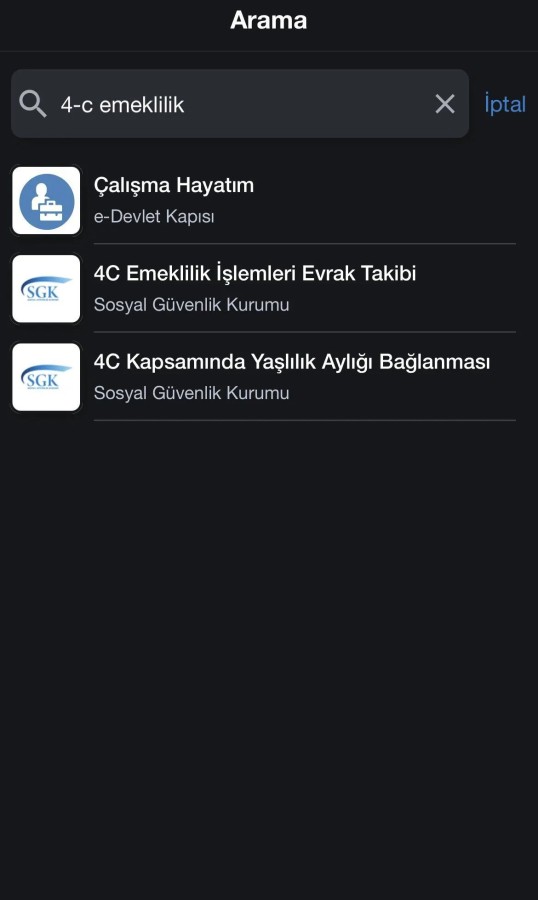 E-Devlete giriş yapın, arama bölümüne 4-c emeklilik yazın