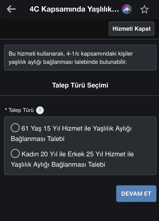 4C Kapsamında Yaşlılık Aylığı Bağlanması Bölümüne girin
