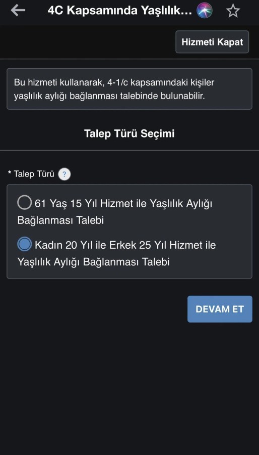 Kadın 20 Yıl ile Erkek 25 Yıl Hizmet ile Yaşlılık Aylığını seçin