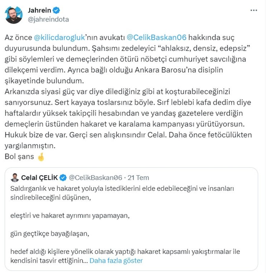 Kılıçdaroğlu'nun kendisine açtığı davalarla gündeme gelen Jahrein lakaplı Twitch yayıncısı Ahmet Sonuç, sosyal medya hesabından Kılıçdaroğlu'nun avukatı Celal Çelik hakkında suç duyurusunda bulunduğunu duyurdu.