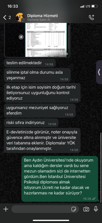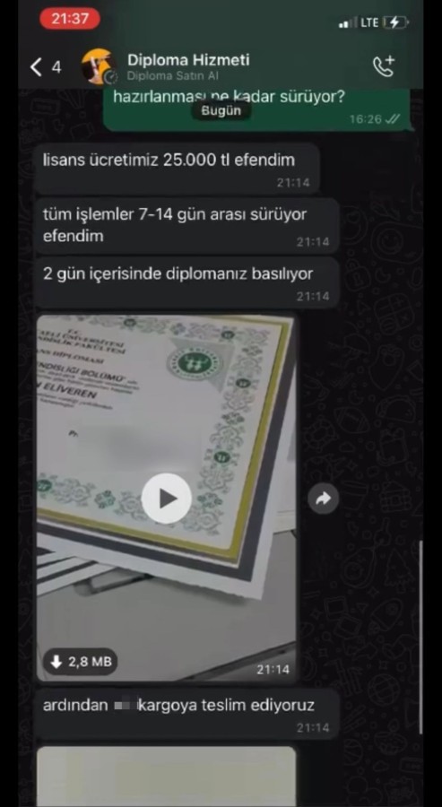 Müşteri şeklinde konuşularak ulaşılan sayfa ise lisans diplomasının yeni ücretinin yüzde 150 zamlı olarak 25 bin lira olduğunu aktardı. Bazı sayfalarda hukuk ve tıp gibi fakülteleri için diğer fakültelere göre daha yüksek ücretler belirlenmesi de dikkat çekti.