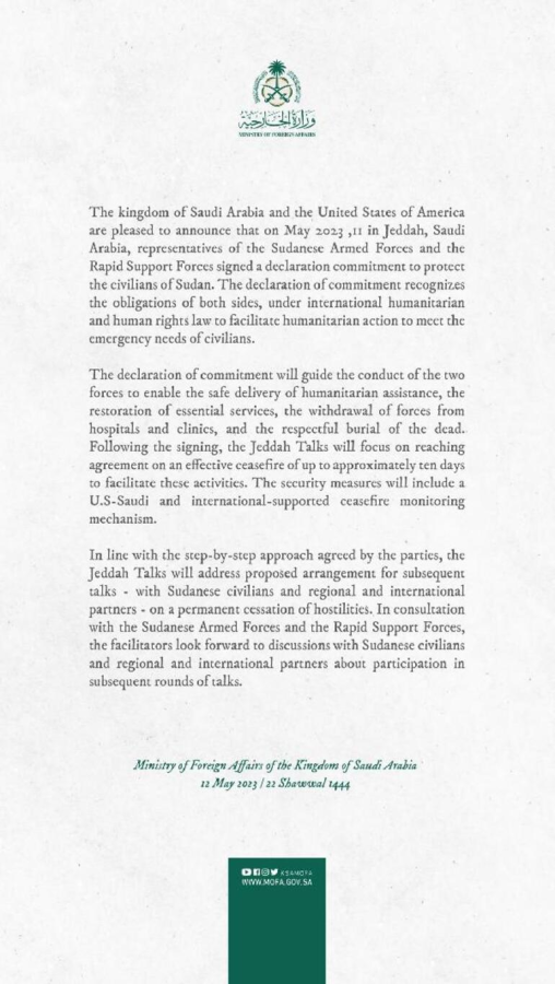 Suudi Arabistan ve ABD tarafından yayımlanan ortak yazılı açıklamaya göre, Suudi Arabistan'ın Cidde kentinde Sudan Silahlı Kuvvetleri ve Hızlı Destek Kuvvetleri (HDK) temsilcileri 'Sudan'daki Sivilleri Koruma Taahhüdü Deklarasyonu'nu imzaladı.