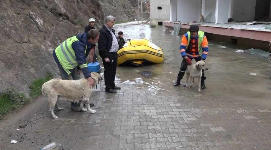 Karayla bağlantısı kesilen binalardan kedi ve köpek seslerini duyan vatandaşların haber vermesi üzerine ekipler harekete geçip, kurtarma çalışması başlattı.