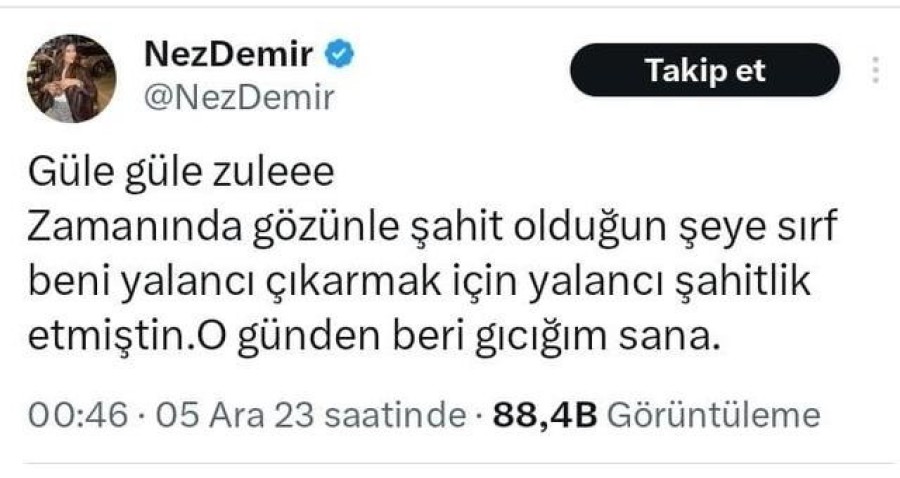 Nez Demir, Şule'nin gözaltına alınmasının ardından 'Güle güle zule. Zamanında gözünle şahit olduğun şeye sırf beni yalancı çıkarmak için yalancı şahitlik etmiştin. O günden beri gıcığım sana.' yazdı. Ünlü fenomenin bu paylaşımı kısa sürede etkileşim aldı.