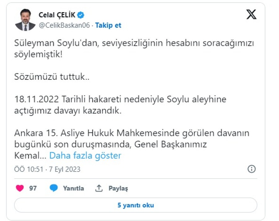 CHP lideri Kılıçdaroğlu'nun avukatı Celal Çelik, sosyal medya hesabından yaptığı açıklamada, Süleyman Soylu aleyhine 18 Kasım 2022 tarihindeki sözleri nedeniyle açtıkları tazminat davasını kazandıklarını duyurdu.