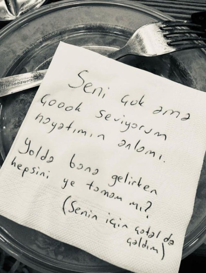 Sümeyye Aydoğan'ın paylaşımında "Seni çok ama çok seviyorum hayatımın anlamı. Yolda bana gelirken hepsini ye tamam mı? Senin için çatal da çaldım" notu dikkat çekti.