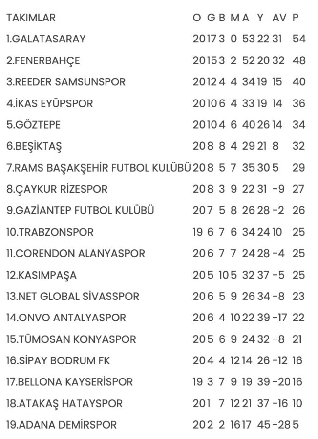 Ligde tamamlanan haftanın ardından oluşan puan durumu şu şekilde: