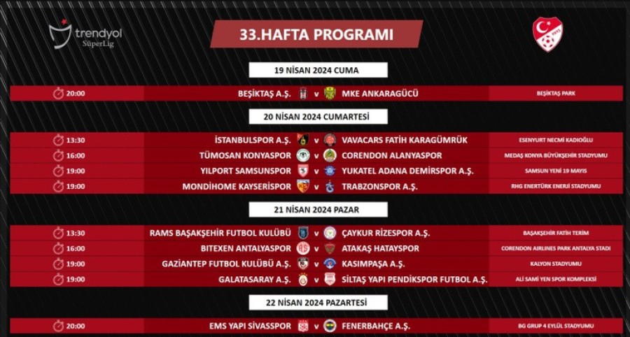 Türkiye Futbol Federasyonu'nun resmi internet sitesinden yapılan açıklamada Süper Lig'de 33. haftanın programı açıklandı.