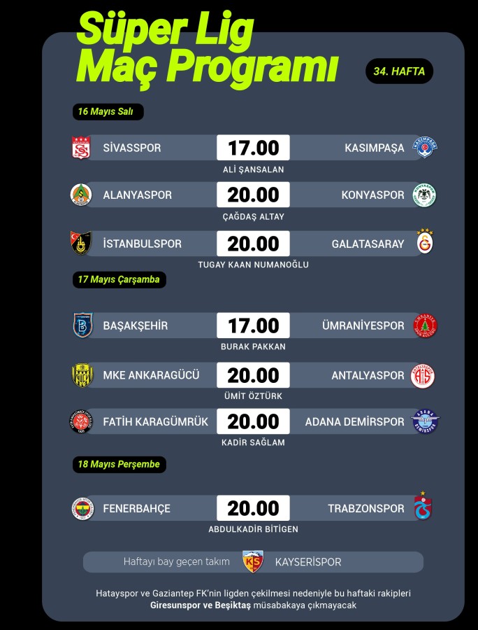 Türkiye Futbol Federasyonu'ndan yapılan açıklamaya göre, Süper Lig'de haftanın programı şu şekilde.