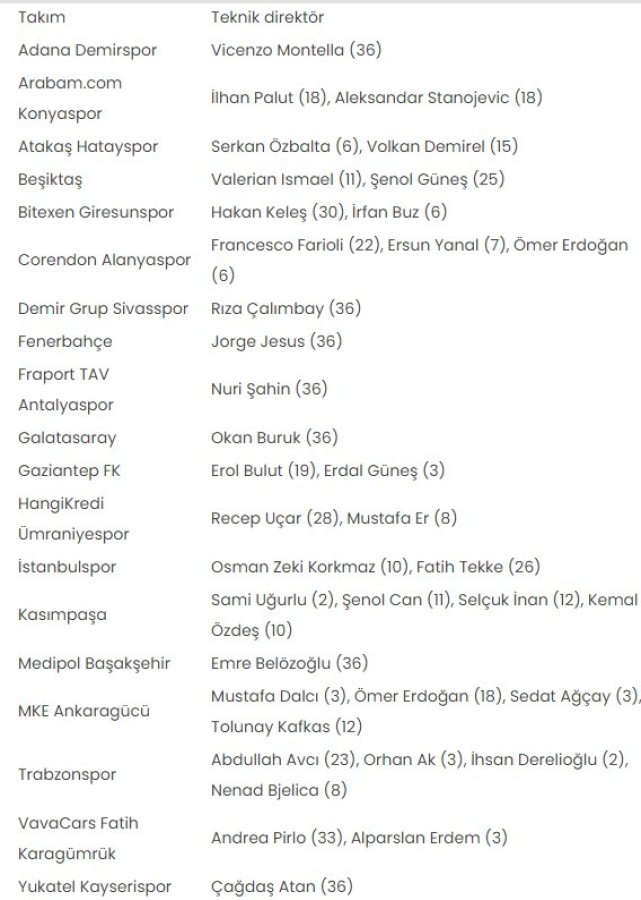 Şampiyon Galatasaray'da Okan Buruk, Fenerbahçe'de Jorge Jesus, Adana Demirspor'da Vicenzo Montella, Medipol Başakşehir'de Emre Belözoğlu, Demir Grup Sivasspor'da Rıza Çalımbay, Fraport TAV Antalyaspor'da Nuri Şahin ve Yukatel Kayserispor'da Çağdaş Atan sezon boyunca takımlarının başında kaldı.