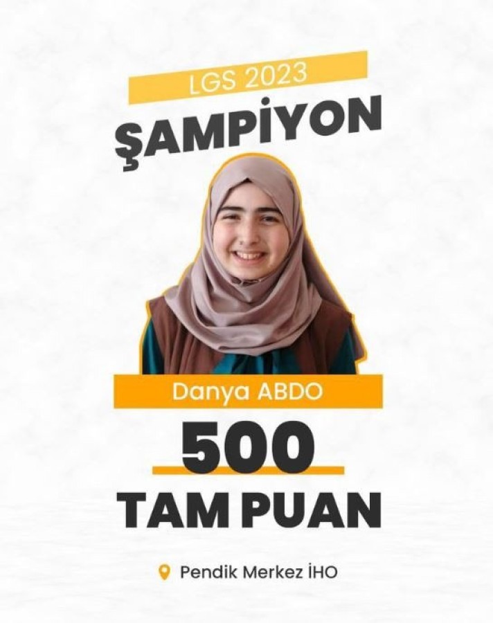 Pendik Merkez İmam Hatip Ortaokulu öğrencisi Suriyeli Danya Abdo, Liselere Geçiş Sistemi (LGS) sınavında 500 tam puan alarak Türkiye birinciliğini elde etti.