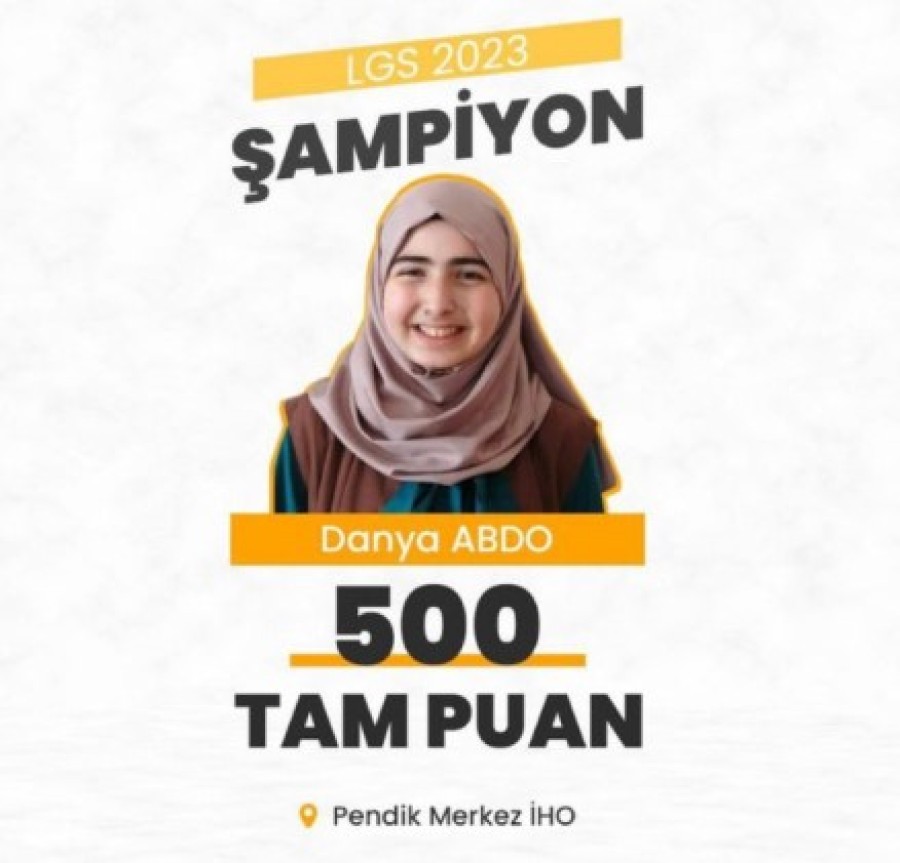 Pendik Merkez İmam Hatip Ortaokulu öğrencisi Suriyeli Danya Abdo, Liselere Geçiş Sistemi (LGS) sınavında 500 tam puan alarak Türkiye birincisi oldu. Türkiye genelindeki imam hatip ortaokullarından sınava katılan öğrencilerden 47'si de 500 tam puan alarak adını şampiyonlar arasına yazdırdı. Pendik İlçe Millî Eğitim Müdürlüğü de Danya Abdo ve diğer 5 öğrencisine tebrik mesajı yayınladı.