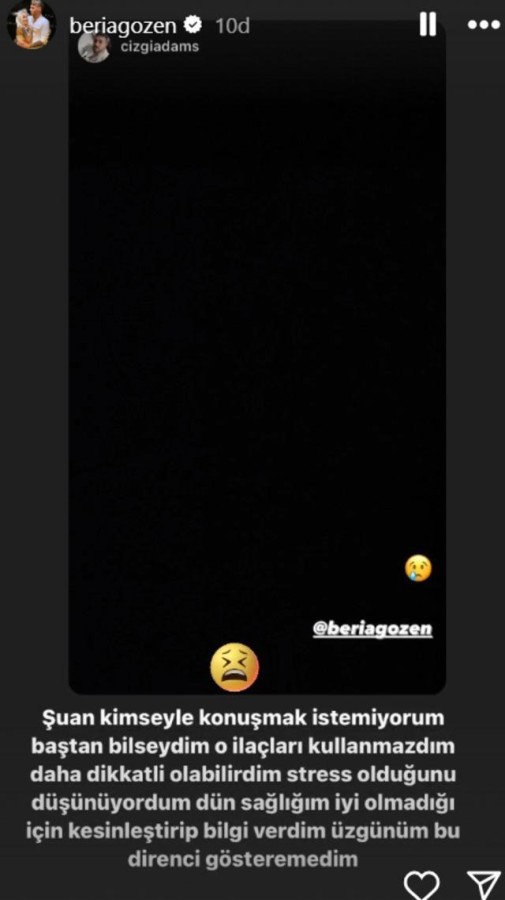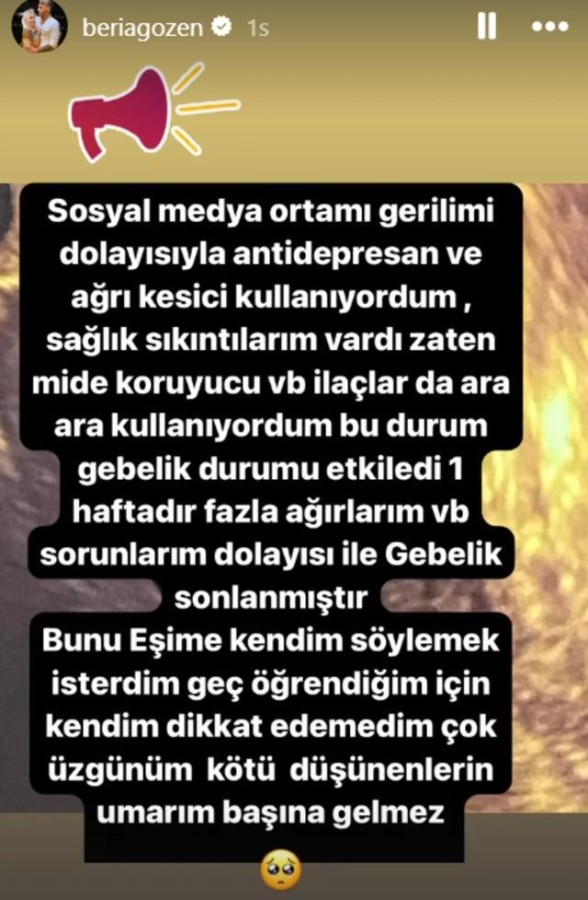 Beria Özden şu ifadeleri kullandı: "Sosyal medya ortamı, gerilimi dolayısıyla antidepresan ve ağrı kesici kullanıyordum. Sağlık sıkıntılarım vardı zaten mide koruyucu vb. ilaçlar da ara ara kullanıyordum. Bu durum gebeliği etkiledi. 1 haftadır fazla ağrılarım vb. sorunlarım dolayısıyla gebelik sonlanmıştır. Bunu eşime kendim söylemek isterdim geç öğrendiğim için kendim dikkat edemedim çok üzgünüm. Kötü düşünenlerin umarım başına gelmez."