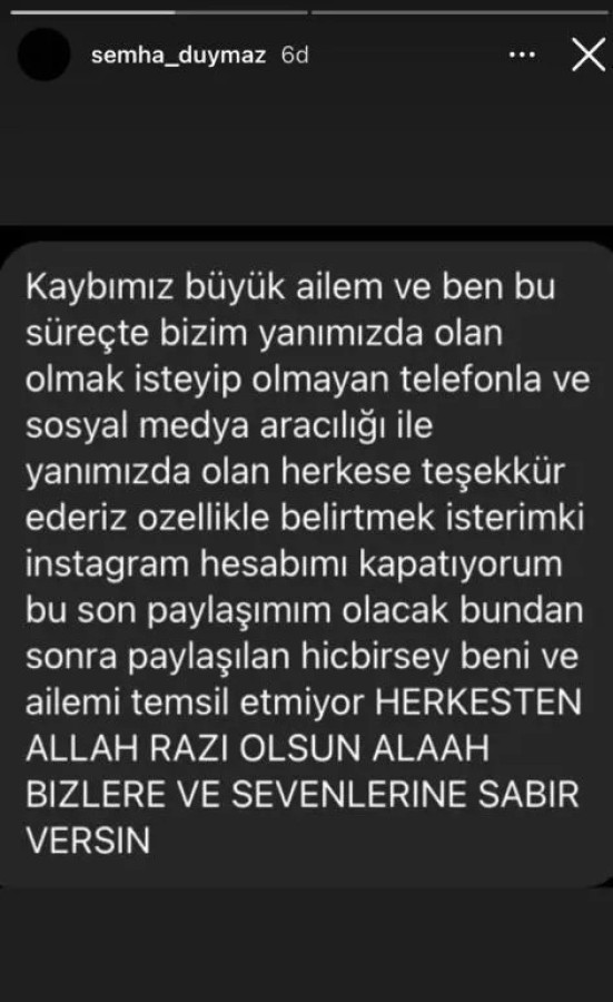 Bir diğer paylaşımında da hesabını kapatacağını ve artık yapılacak paylaşımların kendisi ve ailesiyle bir ilgisinin olmayacağını belirten Semiha Duymaz, paylaşımında şu ifadelere yer verdi: