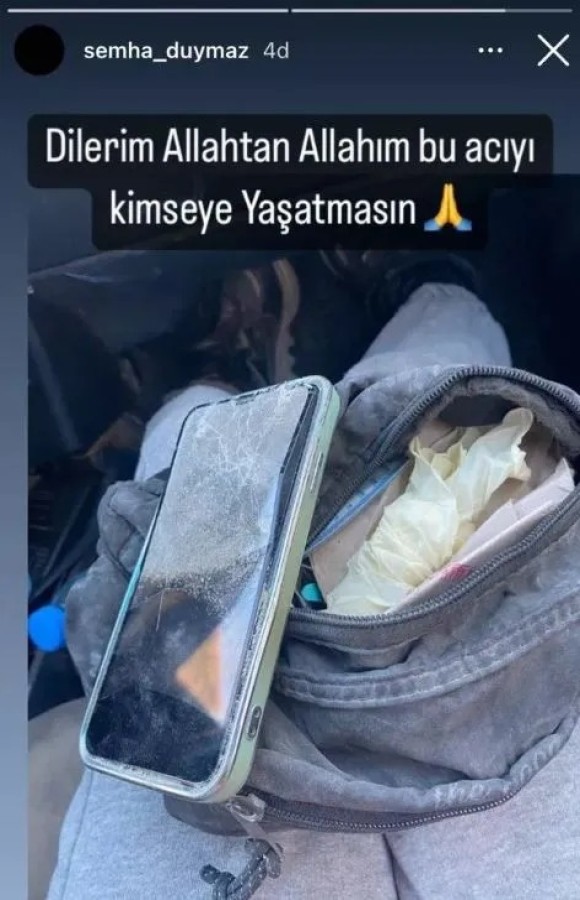 Abla Duymaz, Instagram hesabı üzerinden iki paylaşımda bulundu. İlk olarak Taha ya da kardeşi Melek'e ait olan bir telefonu çeken Semiha Duymaz, "Dilerim Allah'tan Allah'ım kimseye bu acıyı yaşatmasın" notunu düştü.