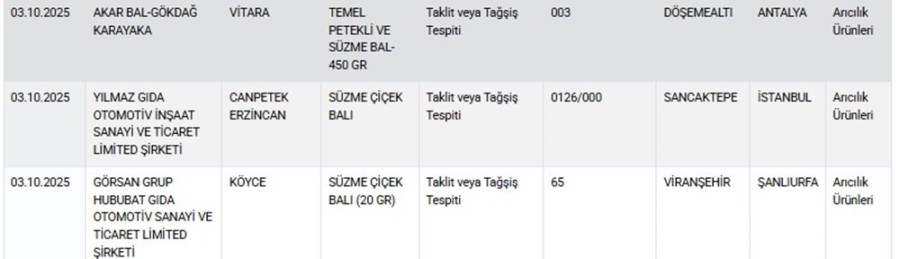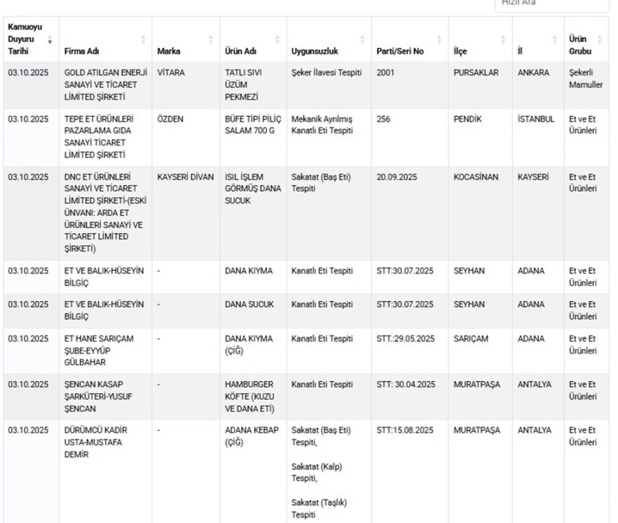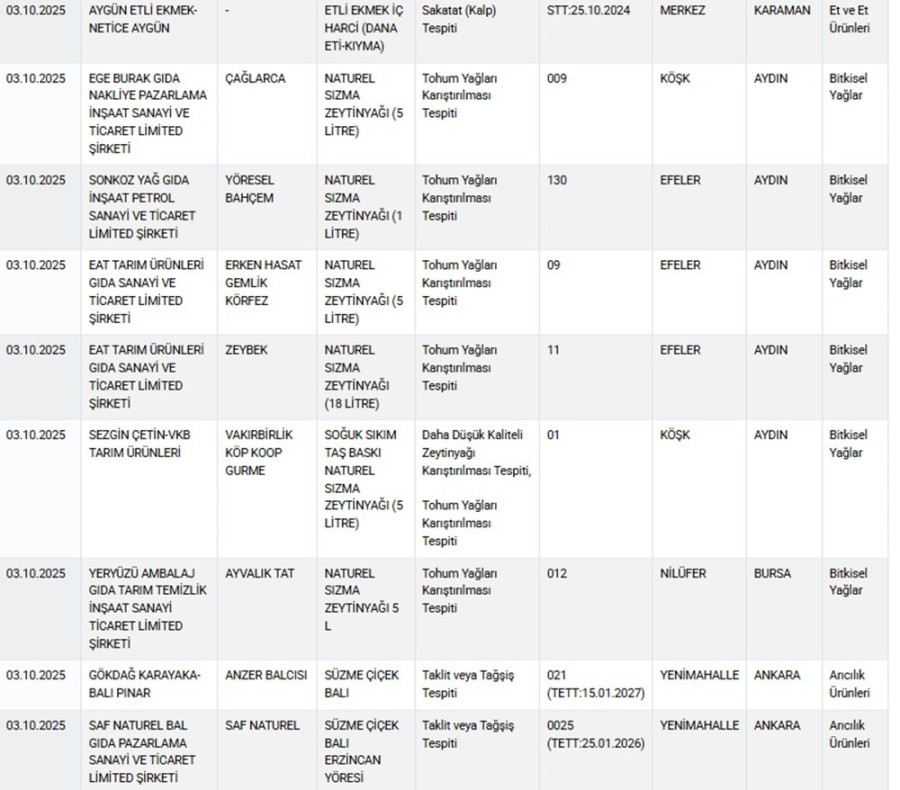 Bakanlık listesinde bu kez zeytinyağı, bal, kıyma ve sucuk gibi ürünler yer aldı.