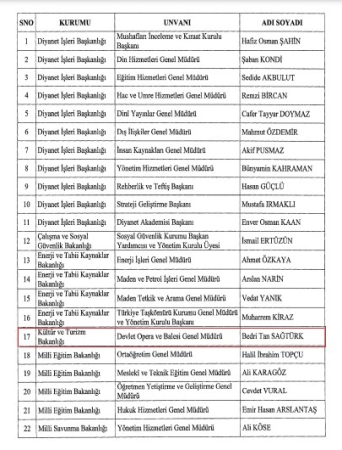 Cumhurbaşkanı Erdoğan'ın imzasıyla yayınlanan kararnameye göre; balet Tan Sağtürk, Devlet Opera ve Balesi Genel Müdürlüğü'nde görevlendirildi.