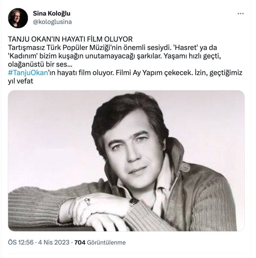 Yazar-müzisyen Sina Koloğlu, söz konusu haberi, "Tartışmasız Türk Popüler Müziği'nin önemli sesiydi. 'Hasret' ya da 'Kadınım' bizim kuşağın unutamayacağı şarkılar. Yaşamı hızlı geçti, olağanüstü bir ses... Tanju Okan'ın hayatı film oluyor. Filmi Ay Yapım çekecek" diyerek açıkladı.