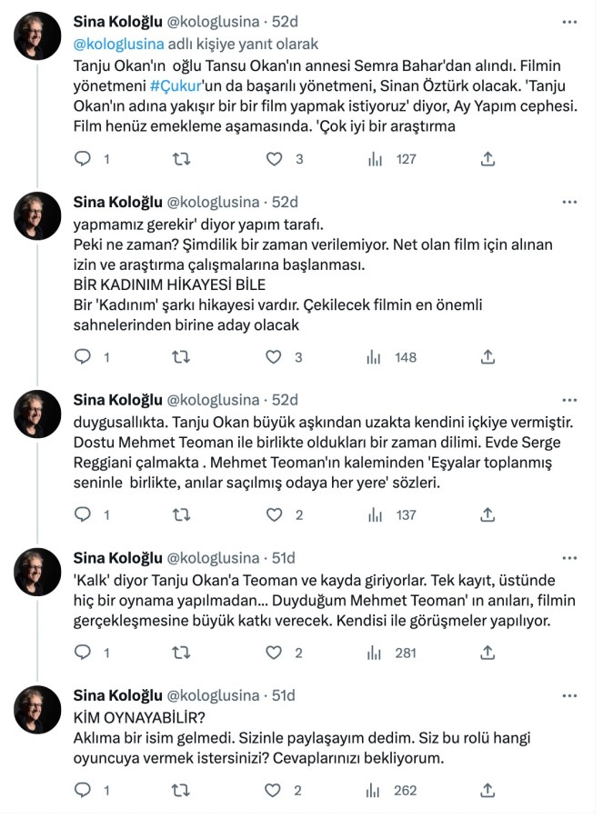 "Film için iznin geçen yıl vefat eden Tanju Okan'ın oğlu Tansu Okan'ın annesi Semra Bahar'dan alındığını belirten Koloğlu, "Filmin yönetmeni Çukur'un da başarılı yönetmeni, Sinan Öztürk olacak. 'Tanju Okan'ın adına yakışır bir film yapmak istiyoruz' diyor, Ay Yapım cephesi. Film henüz emekleme aşamasında. 'Çok iyi bir araştırma yapmamız gerekir' diyor yapım tarafı.