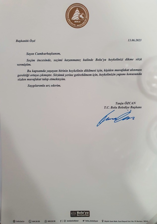 Cumhurbaşkanlığı seçimlerinden önce "Erdoğan seçimi kazanırsa Bolu'nu en görünür yerine heykelini dikeceğim" diyen Bolu Belediye Başkanı Özcan, heykeli dikmek için Cumhurbaşkanı Erdoğan'dan muvakatname istediğini sosyal medya hesabından paylaştı.