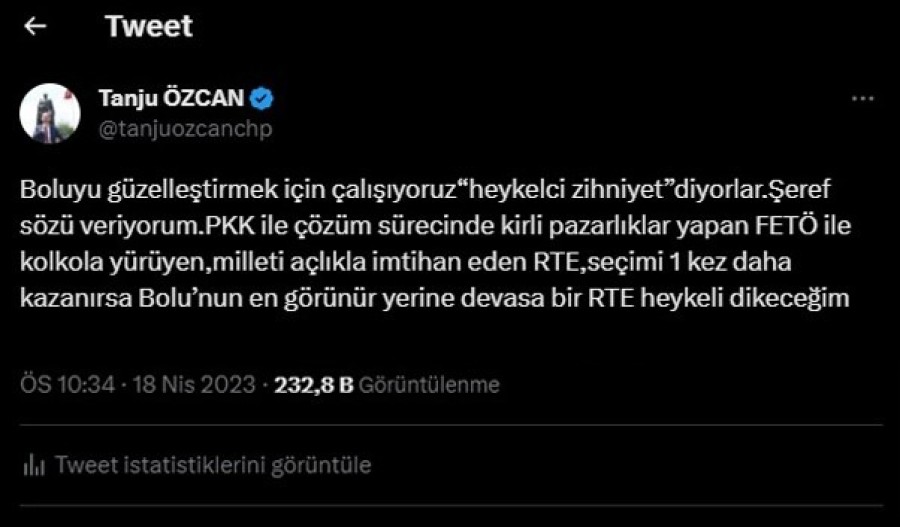 Bolu Belediye Başkanı Tanju Özcan attığı bir tweet nedeniyle Cumhurbaşkanı Recep Tayyip Erdoğan'ın heykelini dikmek için harekete geçti.