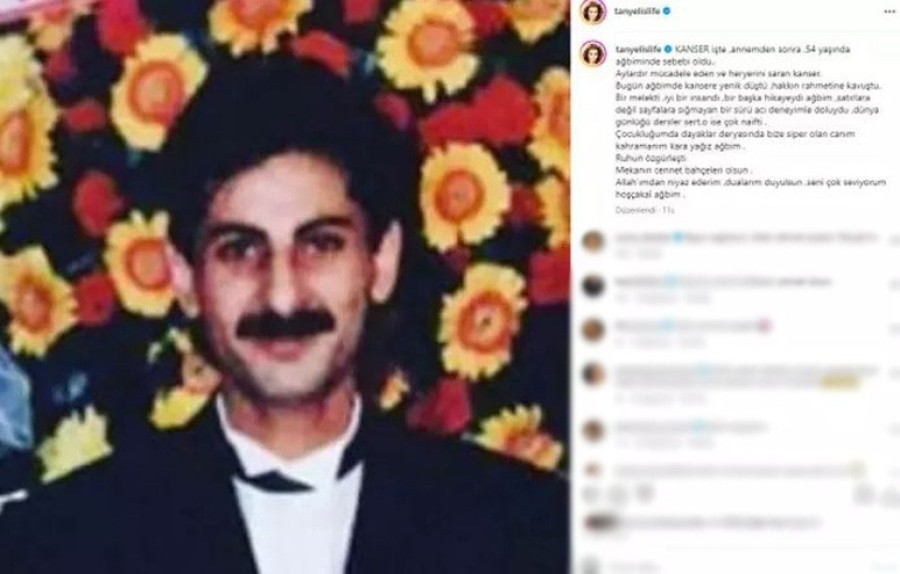 Abisinin fotoğrafını yayınlayan Tanyeli, "Kanser işte annemden sonra 54 yaşında abimin de sebebi oldu... Aylardır mücadele eden ve her yerini saran kanser... Bugün abim de kansere yenik düştü, hakkın rahmetine kavuştu. Bir melekti, iyi bir insandı, bir başka hikayeydi abim, satırlara değil sayfalara sığmayan bir sürü acı deneyimle doluydu, dünya günlüğü dersler sert, o ise çok naifti. Çocukluğumda dayaklar deryasında bize siper olan canım kahramanım kara yağız abim. Ruhun özgürleşti. Mekanın cennet bahçeleri olsun. Allah'ımdan niyaz ederim, dualarım duyulsun, seni çok seviyorum hoşça kal abim" ifadelerini kullandı.