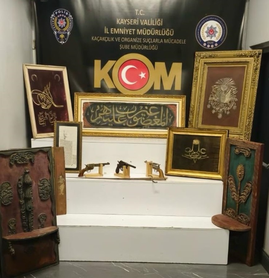 Bunun üzerine belirlenen adrese düzenlenen operasyonda şüpheli yakalandı. Yapılan aramalarda 3 adet toplu tabanca, 6 adet çeşitli dönemlere ait tablo, 2 adet ahşap süslemeli eser ve 1 adet metal kılıç ele geçirildi.