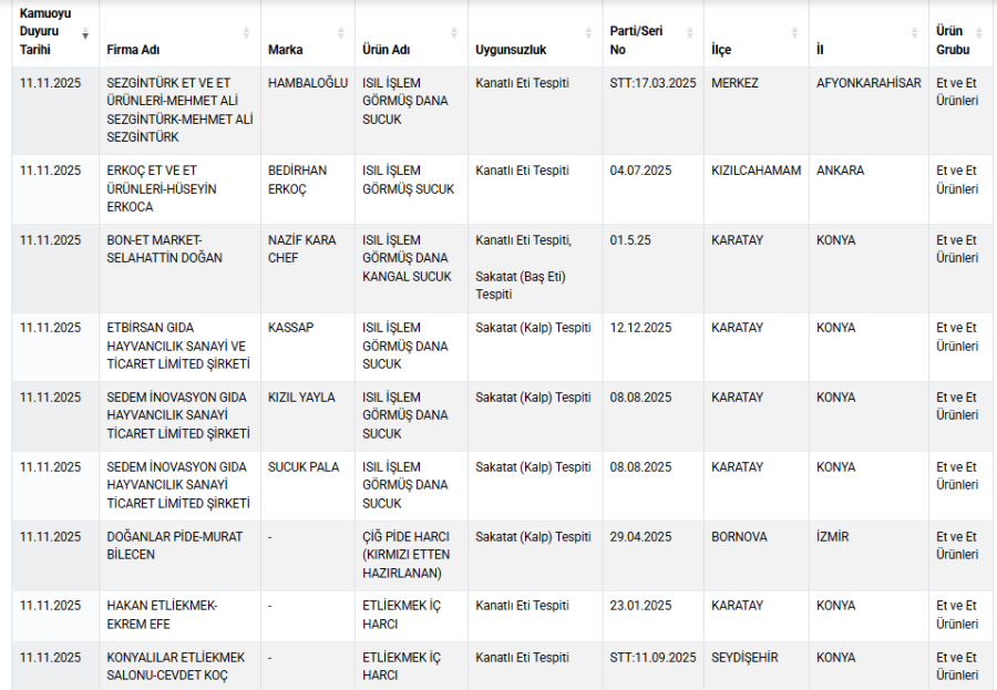 Isıl işlem görmüş dana sucukta kanatlı eti, kalp tespit edildi.