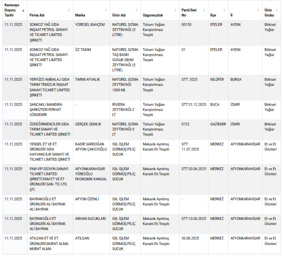 Tarım ve Orman Bakanlığı yeni taklit-tağşiş listesini paylaştı. Pek çok kentte 'güvenilir' olarak bilinen markalar halkın sağlığıyla nasıl oynadıklarını gözler önüne serdi. Bakanlığın kasım ayı taklit-tağşiş listesine göre en çok hile sucuk ve zeytinyağında yapıldı. Tarım ve Orman Bakanlığı'nın taklit ve tağşiş listesinde Bursalı bir firma da yer aldı...