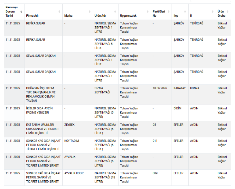 Bursa'da üretim yapan Yeryüzü Ambalaj Gıda Tarım Temizlik İnşaat Sanayi Ticaret Limited Şirketi tarafından satılan Tarım Ayvalık marka zeytinyağına tohum yağları karıştırıldığı tespit edildi.