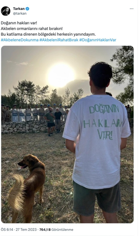 Twitter hesabından paylaşım yapan Tarkan "Doğanın hakları var! Akbelen ormanlarını rahat bırakın! Bu katliama direnen bölgedeki herkesin yanındayım. #AkbeleneDokunma #AkbeleniRahatBırak #DoğanınHaklarıVar" ifadelerini kullandı.