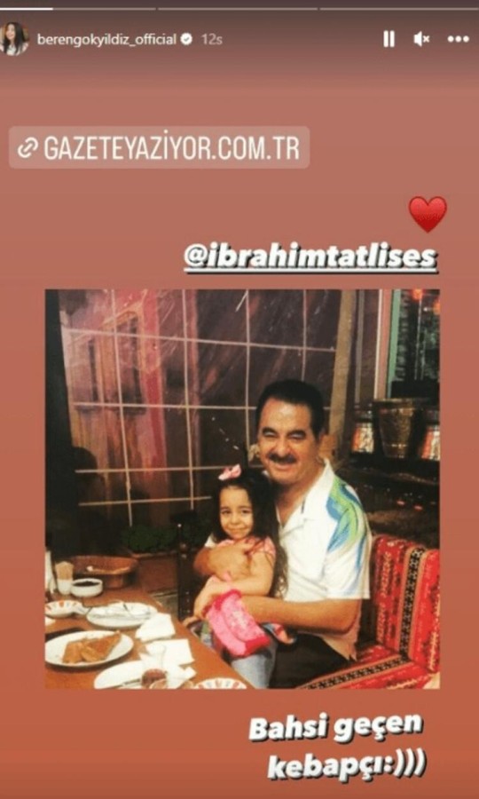 Tatlıses'in paylaşımına Beren Gökyıldız'dan cevap gecikmedi. Tatlıses'in bahsettiği kebapçıda birlikte verdikleri pozu paylaşan Gökyıldız, "Bahsi geçen kebapçı" diyerek kalp emojisi koydu.