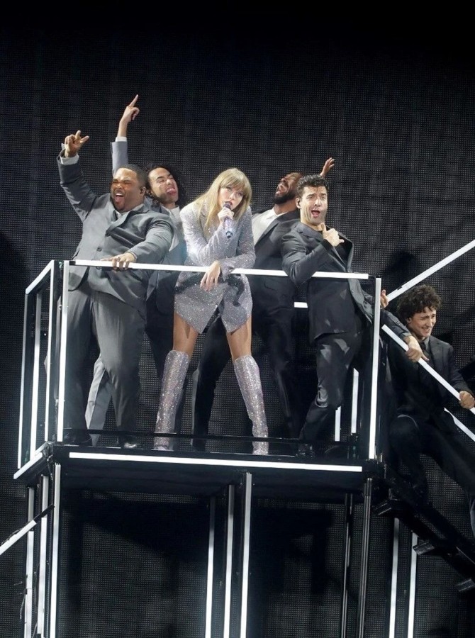 Altın Medusa düğmeleriyle vurgulanan blazer'ın yanı sıra Swift'in aynı derecede etkileyici olan gümüş kruvaze ceketi de turnenin dikkat çekenleri oldu.