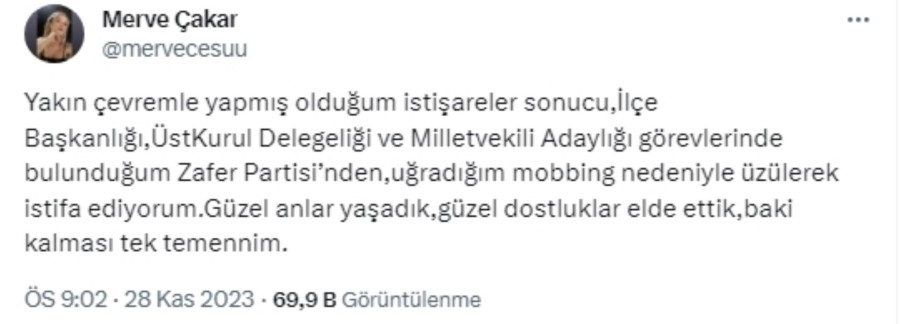 "İlçe Başkanlığı, Üst Kurul Delegeliği ve Milletvekili Adaylığı görevlerinde bulunduğum Zafer Partisi'nden, uğradığım mobbing nedeniyle üzülerek istifa ediyorum. Güzel anlar yaşadık, güzel dostluklar elde ettik, baki kalması tek temennim."