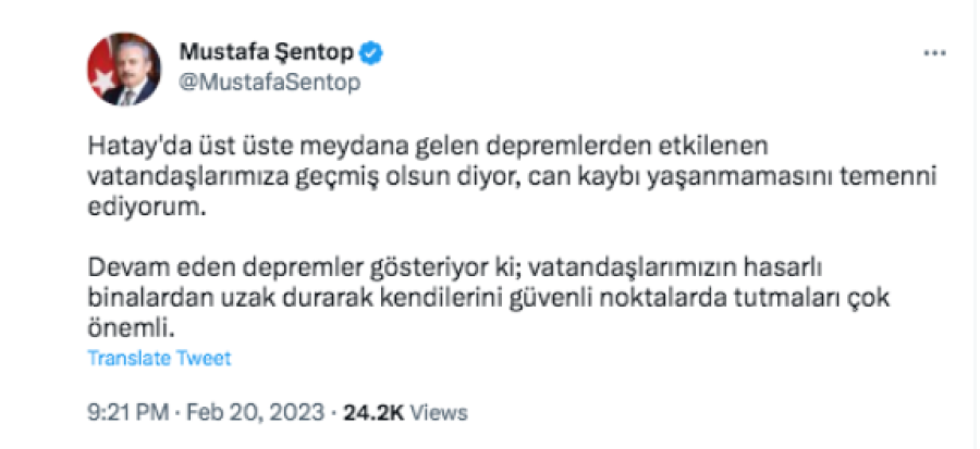 TBMM Başkanı Mustafa Şentop, Hatay'da art arda meydana gelen 6,4 ve 5,8 büyüklüklerindeki depremler nedeniyle vatandaşlara geçmiş olsun dileklerini iletti.