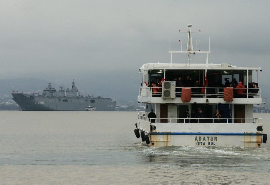 Helikopter ve uçak taşıma kabiliyetine sahip ilk çok maksatlı amfibi gemisi TCG Anadolu'yu görmek için 1 Mart Vapur İskelesine gelenler, saat 13.00'den itibaren güvenlik kontrolünden geçti.