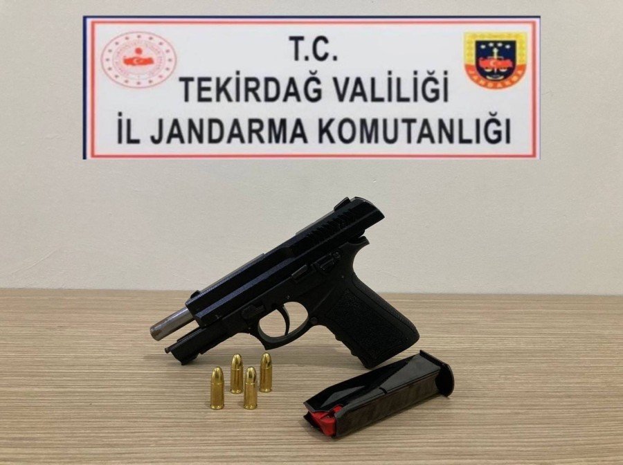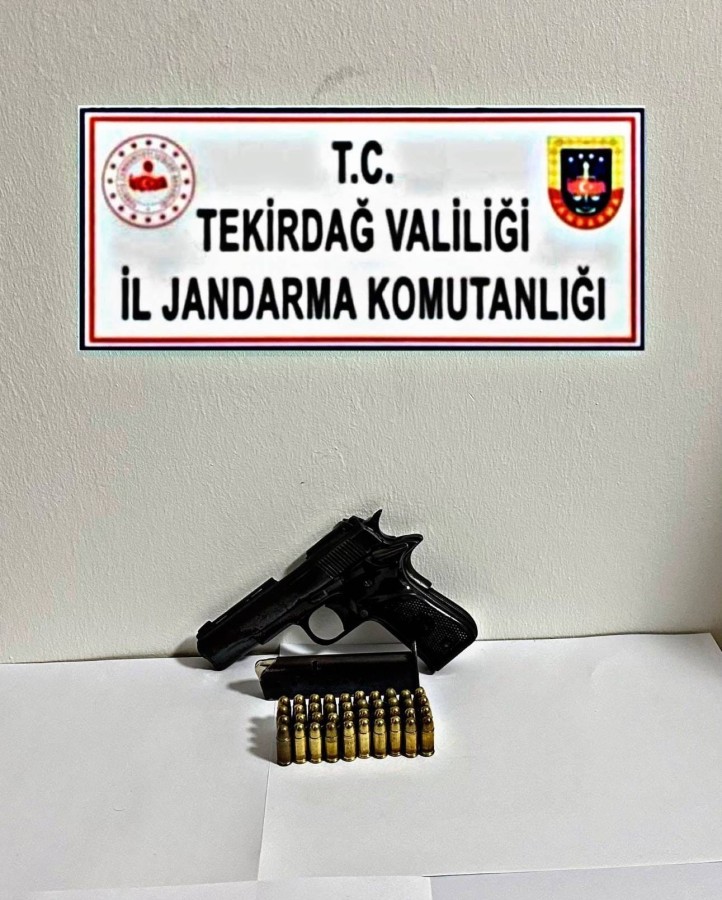 Tekirdağ İl Jandarma Komutanlığınca Çerkezköy Namık Kemal Mahallesinde M.T. isimli şahsın yapılan üst aramasında, 1 adet kuru sıkıdan çevrilme tabanca, 1 adet şarjör ve 11 adet 7,65 mm fişek ele geçirildi.