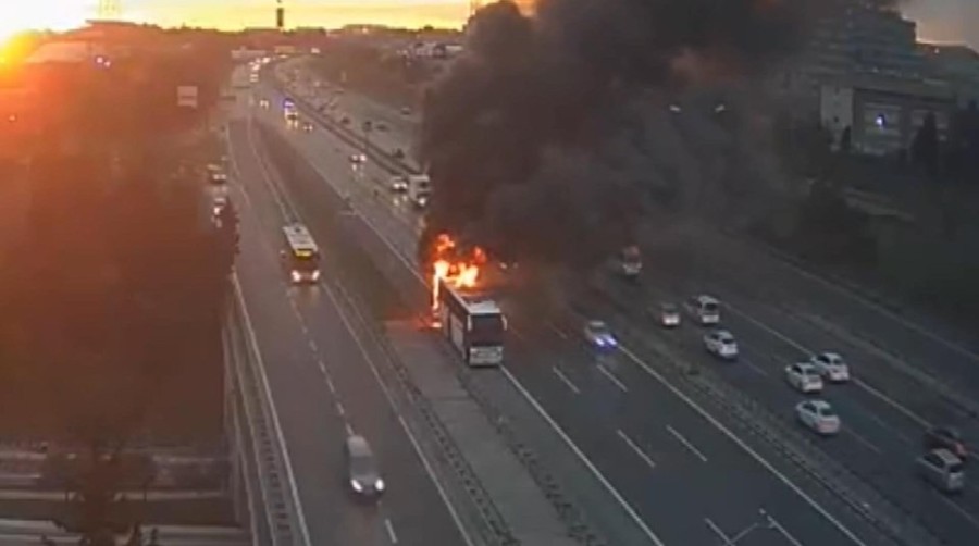 Ümraniye, TEM Otoyolu'nda seyir halinde olan yolcu otobüsünde yangın çıktı. Alev alev yanan otobüse itfaiye ekipleri müdahale etti.