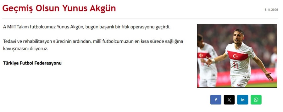 Federasyonun internet sitesinden yayımlanan mesajda, "A Milli Takım futbolcumuz Yunus Akgün, bugün başarılı bir fıtık operasyonu geçirdi. Tedavi ve rehabilitasyon sürecinin ardından, milli futbolcumuzun en kısa sürede sağlığına kavuşmasını diliyoruz" ifadeleri kullanıldı.