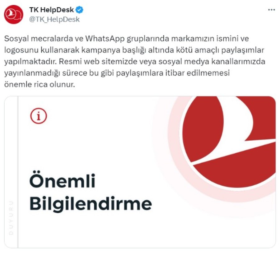 THY'nin resmi destek hesabından yapılan açıklamada, sosyal mecralarda ve "WhatsApp" gruplarında şirket markasının isminin ve logosunun kullanıldığı belirtilerek, kampanya başlığı altında kötü amaçlı paylaşımlar yapıldığı belirtildi.