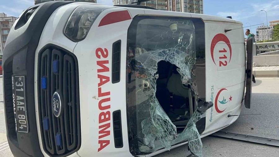 Hatay'da ambulans, hafif ticari araç ile çarpışarak devrildi. Meydana gelen kazada 2 kişi yaralanırken şans ederi ambulansın içinde hasta olmadığı öğrenildi.