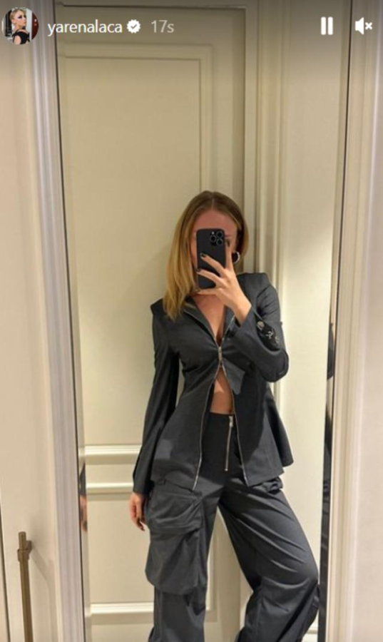 Yaren Alaca iddialı pozlarına bir yenisi daha ekledi ve siyah ceket-siyah pantolon kombiniyle dikkat çekti.