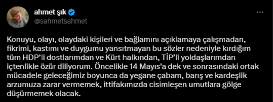 "Konuyu, olayı, olaydaki kişileri ve bağlamını açıklamaya çalışmadan, fikrimi, kastımı ve duygumu yansıtmayan bu sözler nedeniyle kırdığım tüm HDP'li dostlarımdan ve Kürt halkından, TİP'li yoldaşlarımdan içtenlikle özür diliyorum. Öncelikle 14 Mayıs'a dek ve sonrasındaki ortak mücadele geleceğimiz boyunca da yegane çabam, barış ve kardeşlik arzumuza zarar vermemek, ittifakımızda cisimleşen umutlara gölge düşürmemek olacak"