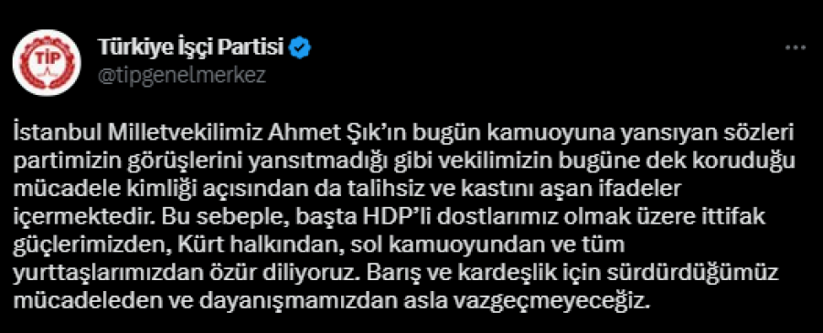 "İstanbul Milletvekilimiz Ahmet Şık'ın bugün kamuoyuna yansıyan sözleri partimizin görüşlerini yansıtmadığı gibi vekilimizin bugüne dek koruduğu mücadele kimliği açısından da talihsiz ve kastını aşan ifadeler içermektedir. Bu sebeple, başta HDP'li dostlarımız olmak üzere ittifak güçlerimizden, Kürt halkından, sol kamuoyundan ve tüm yurttaşlarımızdan özür diliyoruz. Barış ve kardeşlik için sürdürdüğümüz mücadeleden ve dayanışmamızdan asla vazgeçmeyeceğiz."